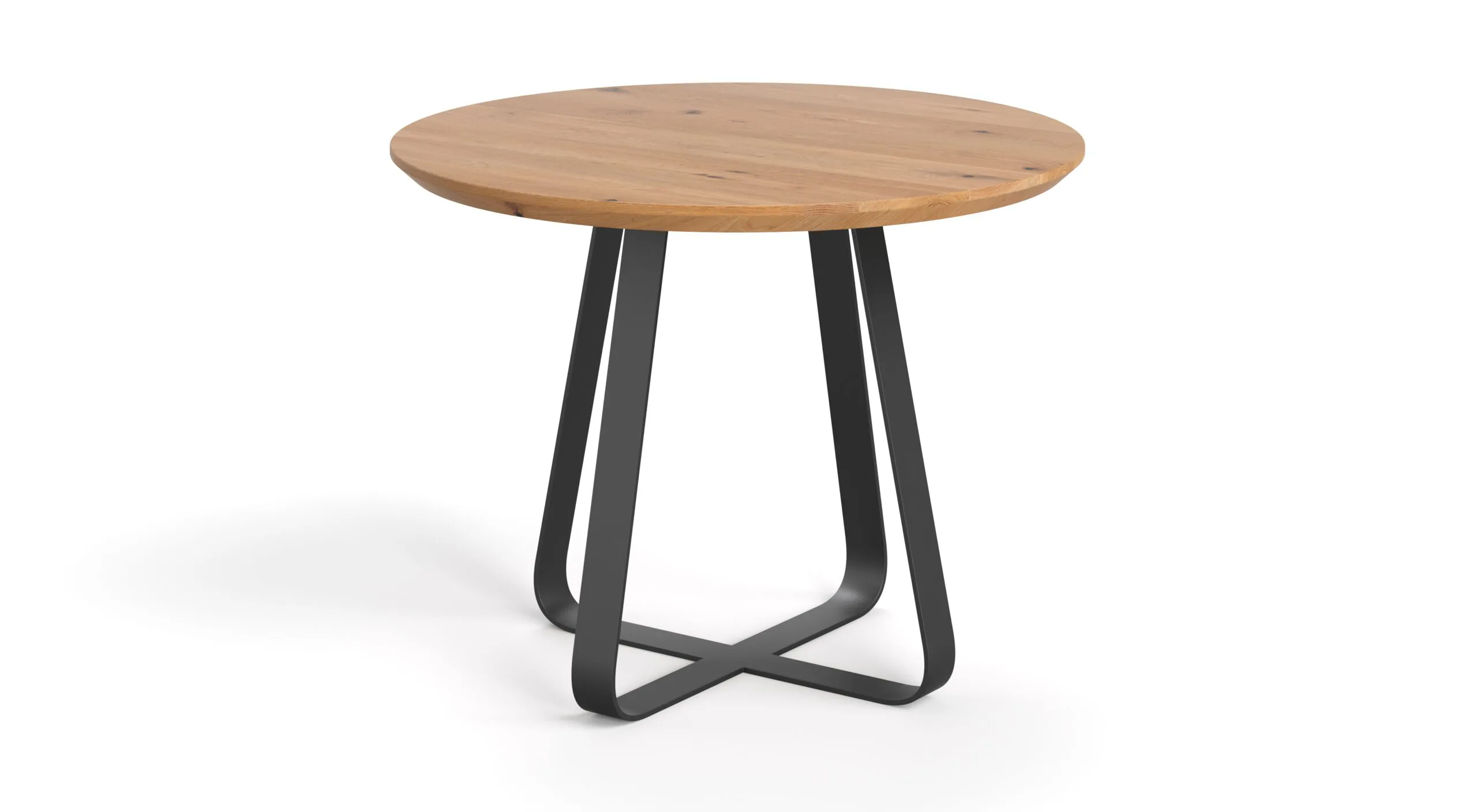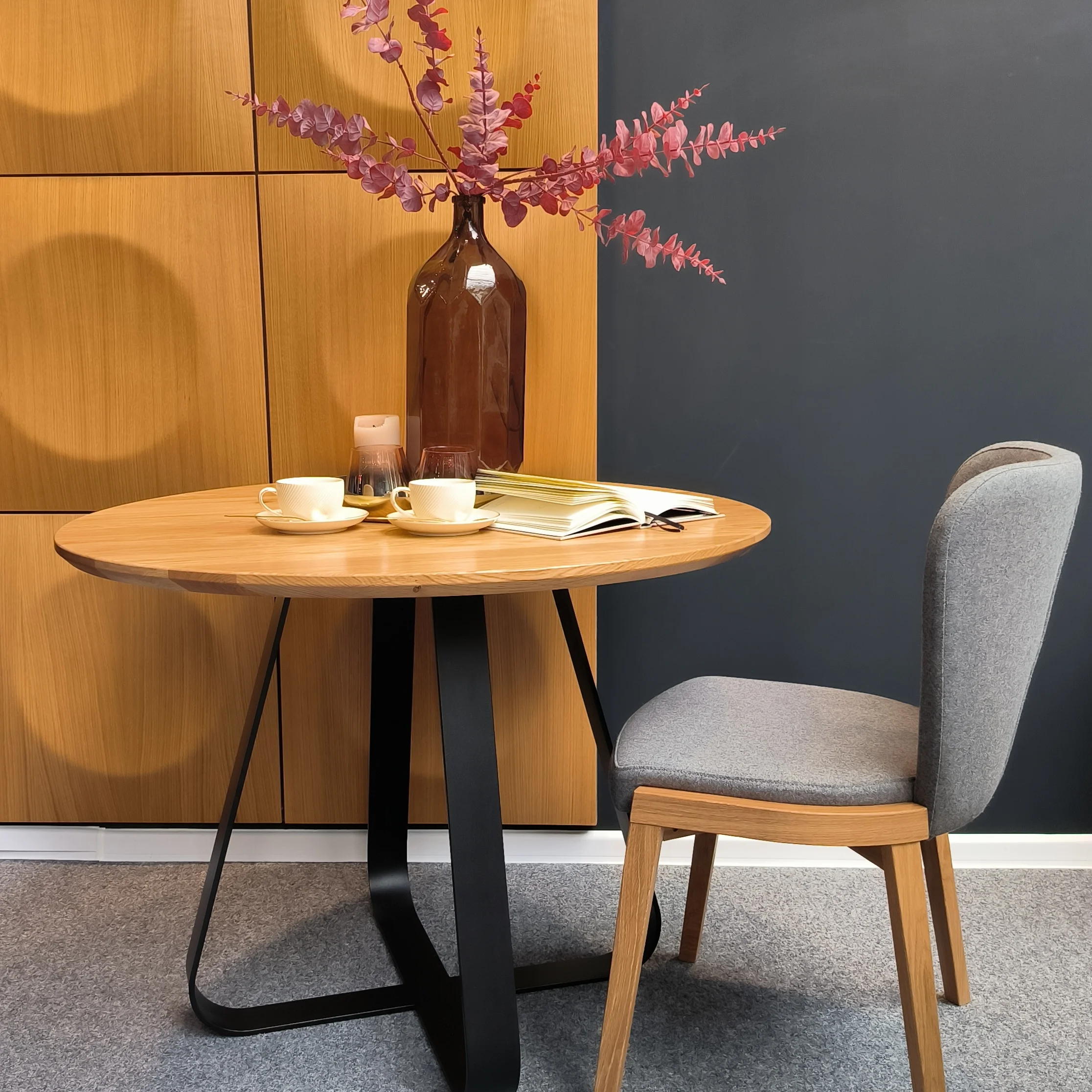 Loop is a unique table that combines the natural beauty of oak wood with a modern, industrial touch of black metal legs. This sleek, round table is perfect for smaller spaces, such as the kitchen, dining room, or living room, creating a comfortable area for shared meals and conversations. The solid oak tabletop, available in sizes from 100 to 130 cm, highlights the classic charm of the piece, and its warm tone pairs beautifully with the minimalist design.